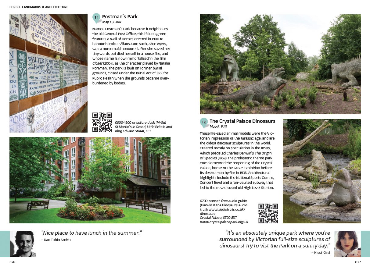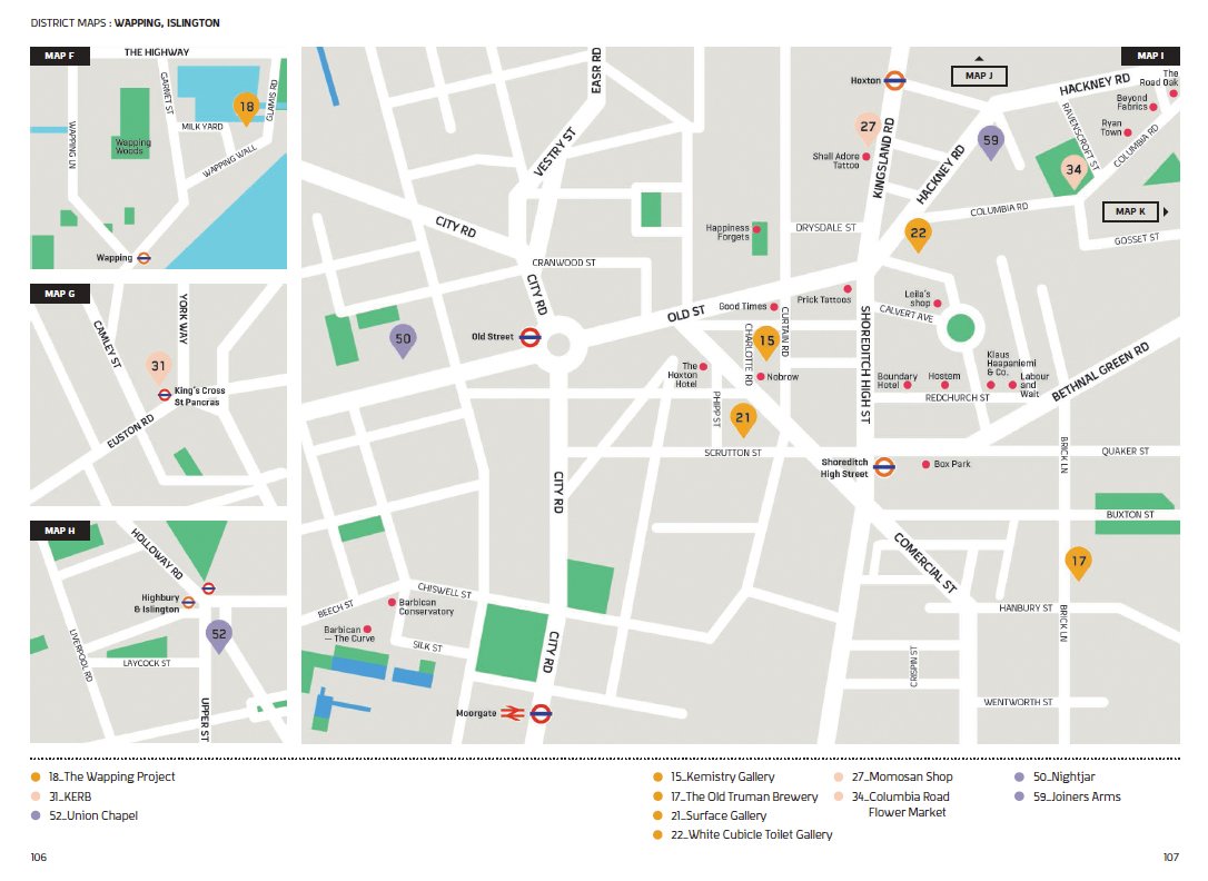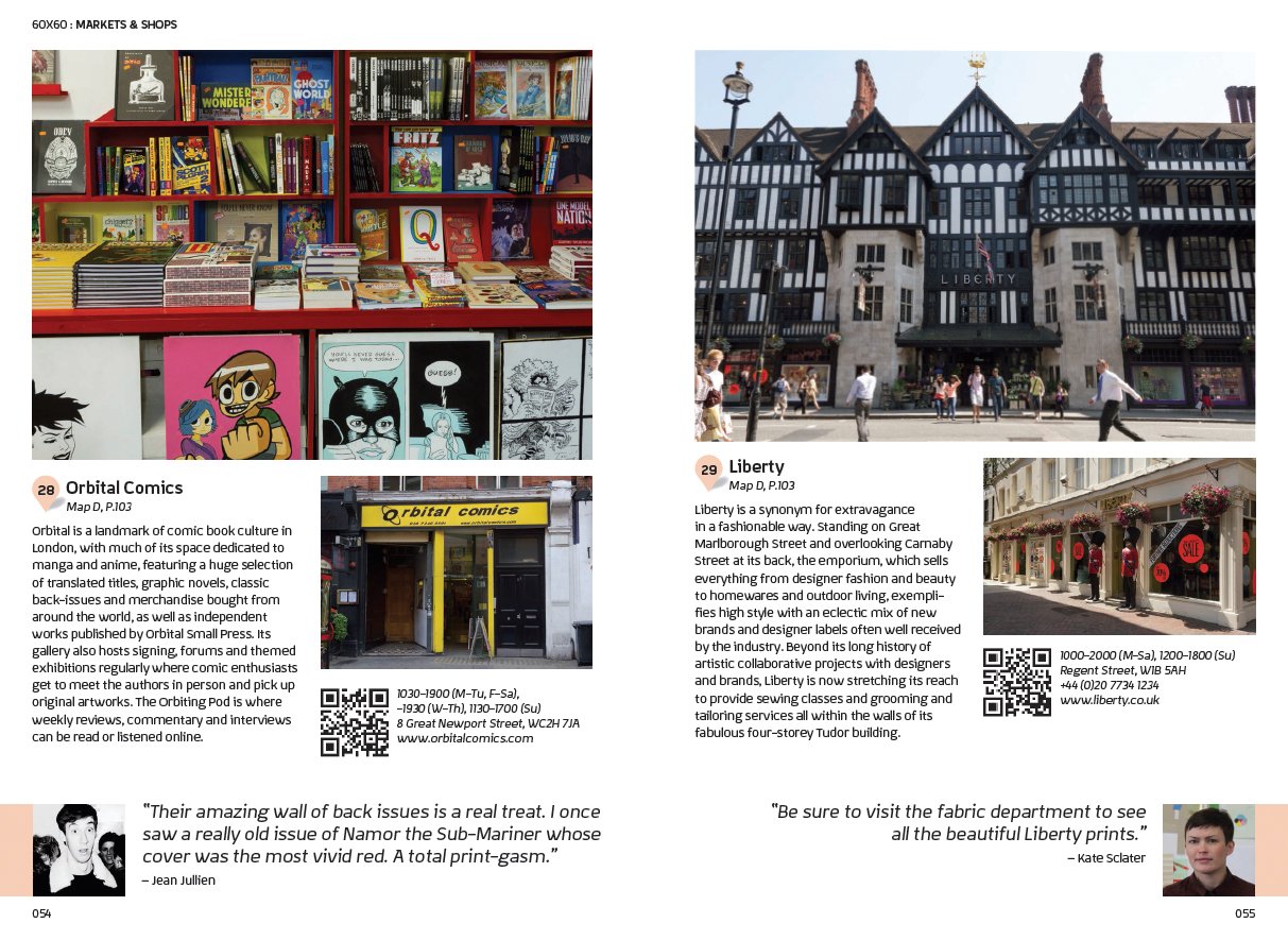 書頁已經是一張手繪地圖,我喜歡。 Creatives who call London home guide you through the best the city has to offer in Victionarys CITIX60-London. Their favorite activities include relaxing in the tropical oasis on the third floor of The Barbican, exploring the vibrant art scene at The Old Truman Brewery, perusing the famous prints at Liberty, getting a taste of the British seaside in the city at Bonnie Gull, and sipping craft cocktails and listening to blues, jazz, swing, and bossa nova at Nightjar. 內頁: